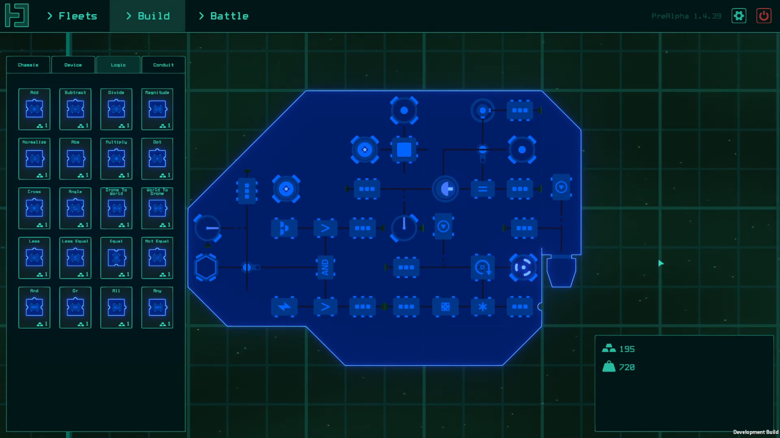 Drone Fleet is my favorite of the many game development projects I have started. It is a puzzle/engineering game where you build a fleet of autonomous drones using simulated parts. Parts can connect to adjacent parts to form a logical circuit that controls the drone's behavior. You then pit your fleet against another fleet and observe how it performs in a battle. Drone Fleet was designed to be an asynchronous multiplayer game where players would exchange fleets via integrated file sharing.